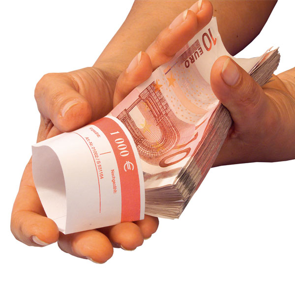 Geldschein-Banderolen eignen sich hervorragend für die Herstellung von bankengerechten Notenbündeln. Sie sind zu Schlaufen geklebt und für alle Euro-Banknoten erhältlich. Die leichte Sortendifferenzierung wird durch die unterschiedliche Druckfarbe sichergestellt.