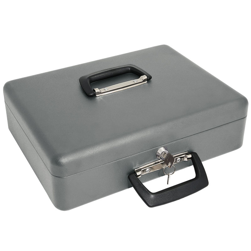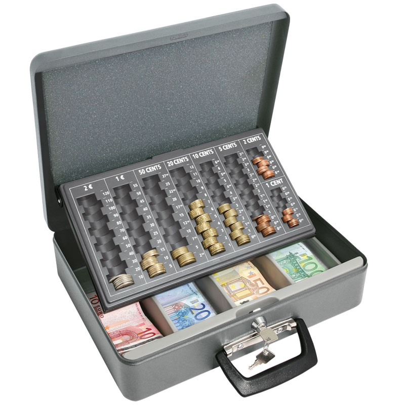 Gefertigt aus pulverbeschichtetem Stahlblech mit zwei Tragegriffen für Münzen und Banknoten. Die Kassette ist mit einem Zylindersicherheitsschloss mit 2 Schlüsseln ausgestattet. Der Hartgeldeinsatz gleitet beim Öffnen des Koffers automatisch nach hinten. Das Münzgeld wird durch den Schaumstoffeinsatz im Deckel beim Transport fixiert. Geldscheinmulde mit 4 Banknotenfächern.