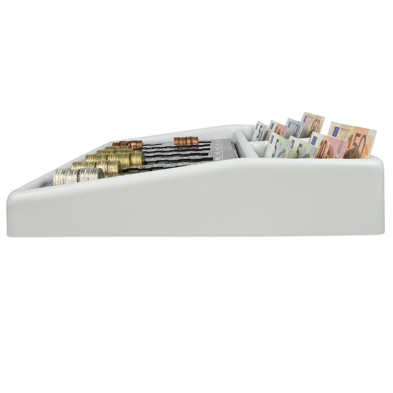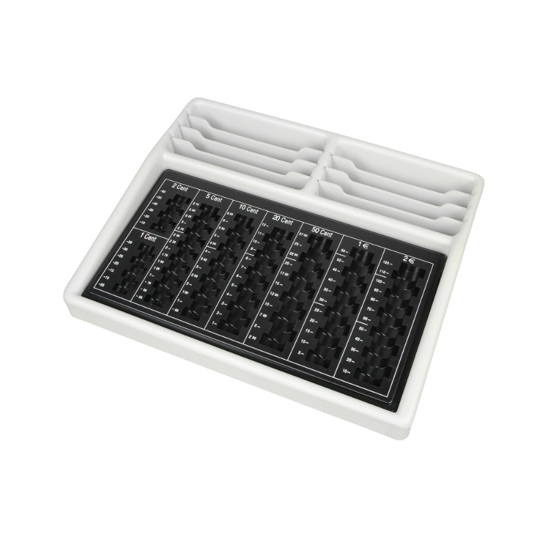 Hartgeld-Zählbrett im Kunststoffrahmen mit 8 Scheinfächern. Das Zählbrett gewährleistet einen leicht abzulesenden Kassenbestand und hält Ordnung in der Schublade.