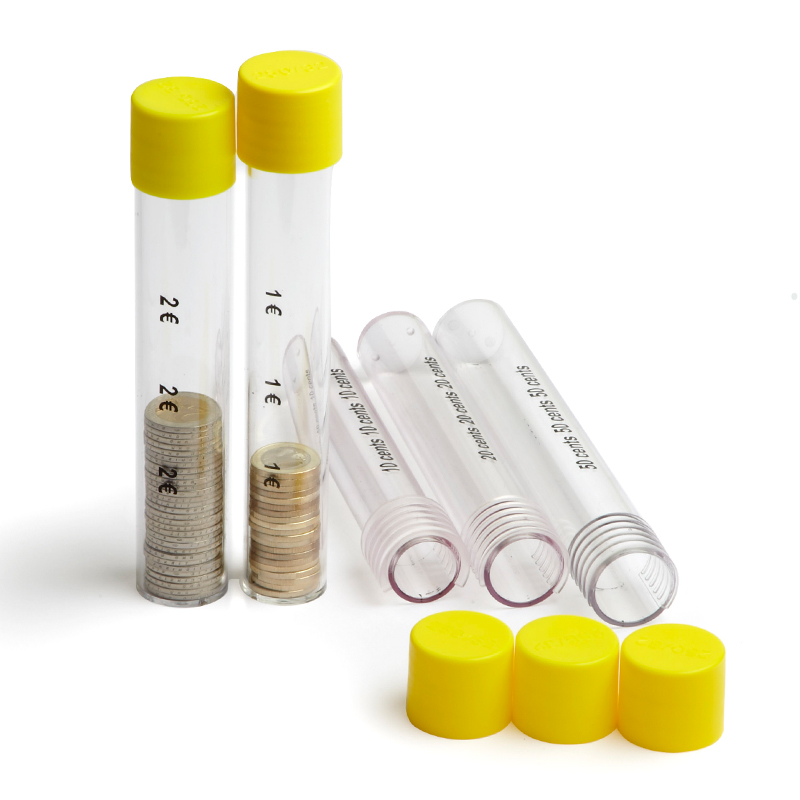 Münzröhren für die übersichtliche Lagerung von Euro-Münzgeld. Stabile Röhren aus durchsichtigem Kunststoff mit gelben Verschlusskappen.
