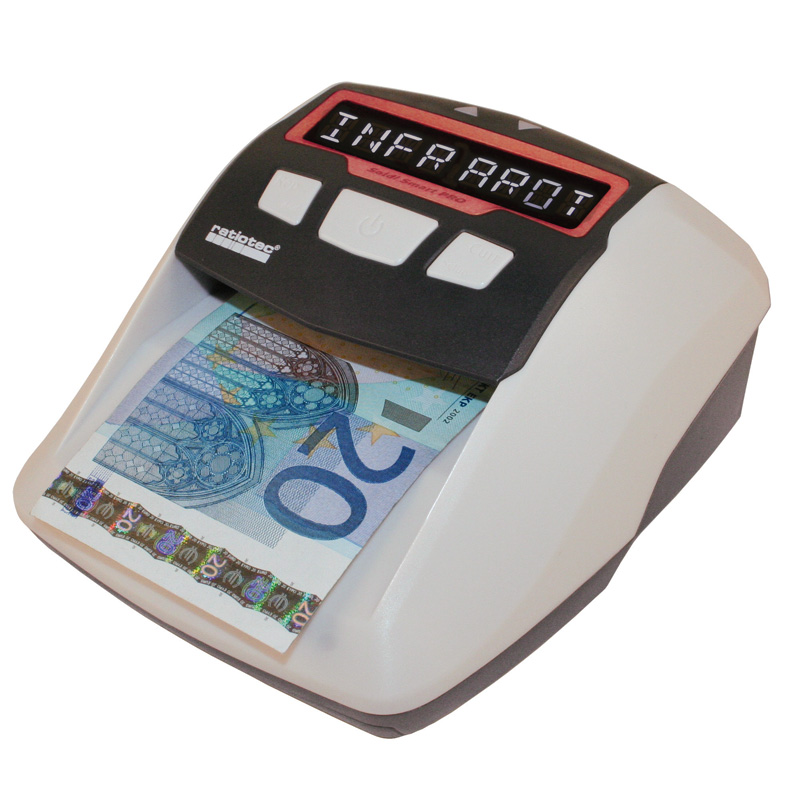 Der Soldi Smart Pro stellt mit seinem innovativen Signalrahmen die neuste Generation von ratiotec Banknotenprüfgeräten dar. Die Banknoten werden in weniger als einer Sekunde auf Echtheit geprüft. Das Gerät signalisiert sofort ein eindeutiges Ergebnis. Das rote Aufleuchten des Signalrahmens sowie das optional zuschaltbare akustische Signal warnen den Benutzer bei verdächtigen Banknoten. Zudem werden im übersichtlichen LED Display die als verdächtig eingestuften Sicherheitsmerkmale in 5 Sprachen angezeigt. Der Soldi Smart Pro eignet sich durch die individuell einstellbaren Funktionen für jeden Bedarf. Die Richtung sowie die Art des Banknotenauswurfs, die Sprache und das Zeitintervall des Standby-Modus sind nur einige Vorteile, die über die selbsterklärende Menüführung problemlos auszuwählen sind. Der Soldi Smart Pro verfügt über eine leicht zu öffnende Frontklappe, so dass eingeklemmte Banknoten und Verschmutzungen leicht zu beseitigen sind. Der optional erhältliche Akku ermöglicht einen mobilen Einsatz des Soldi Smart Pro.