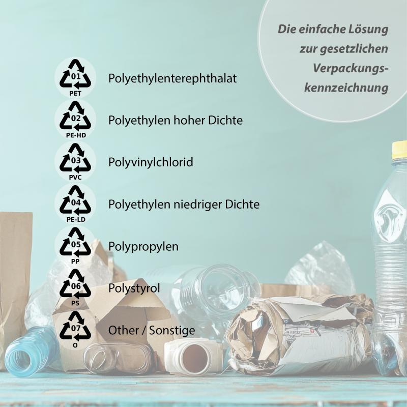 Die Materialkennzeichnung aller Verpackungen mit einheitlichen Recycling- und Entsorgungssymbolen ist Pflicht. Sofern die Umsetzung technisch zu aufwendig oder aufgrund kleiner Stückzahlen nicht wirtschaftlich ist und Sie nach einer unkomplizierten Lösung suchen Ihre Kunststoff-Verpackungen gesetzeskonform* zu kennzeichnen.