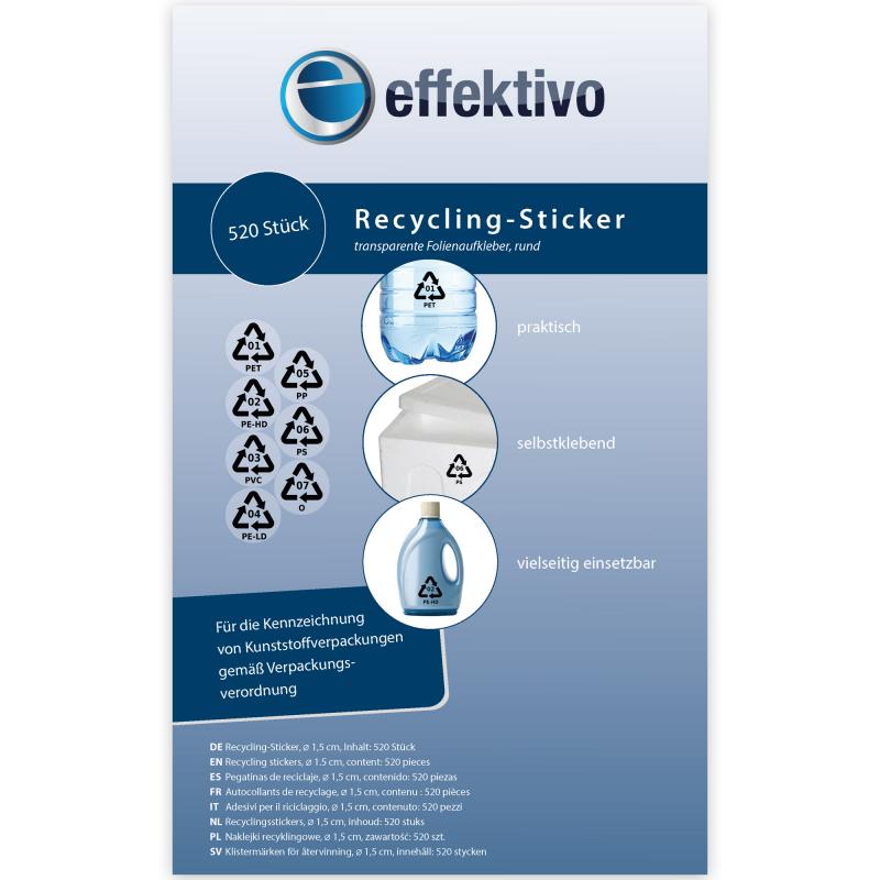 Die selbstklebenden Recycling-Sticker aus klarer Folie. Kennzeichnen Sie Kunststoffverpackungen schnell & einfach mit dem entsprechenden Symbol. Eine Verpackung enthält 520 Aufkleber einer Sorte.